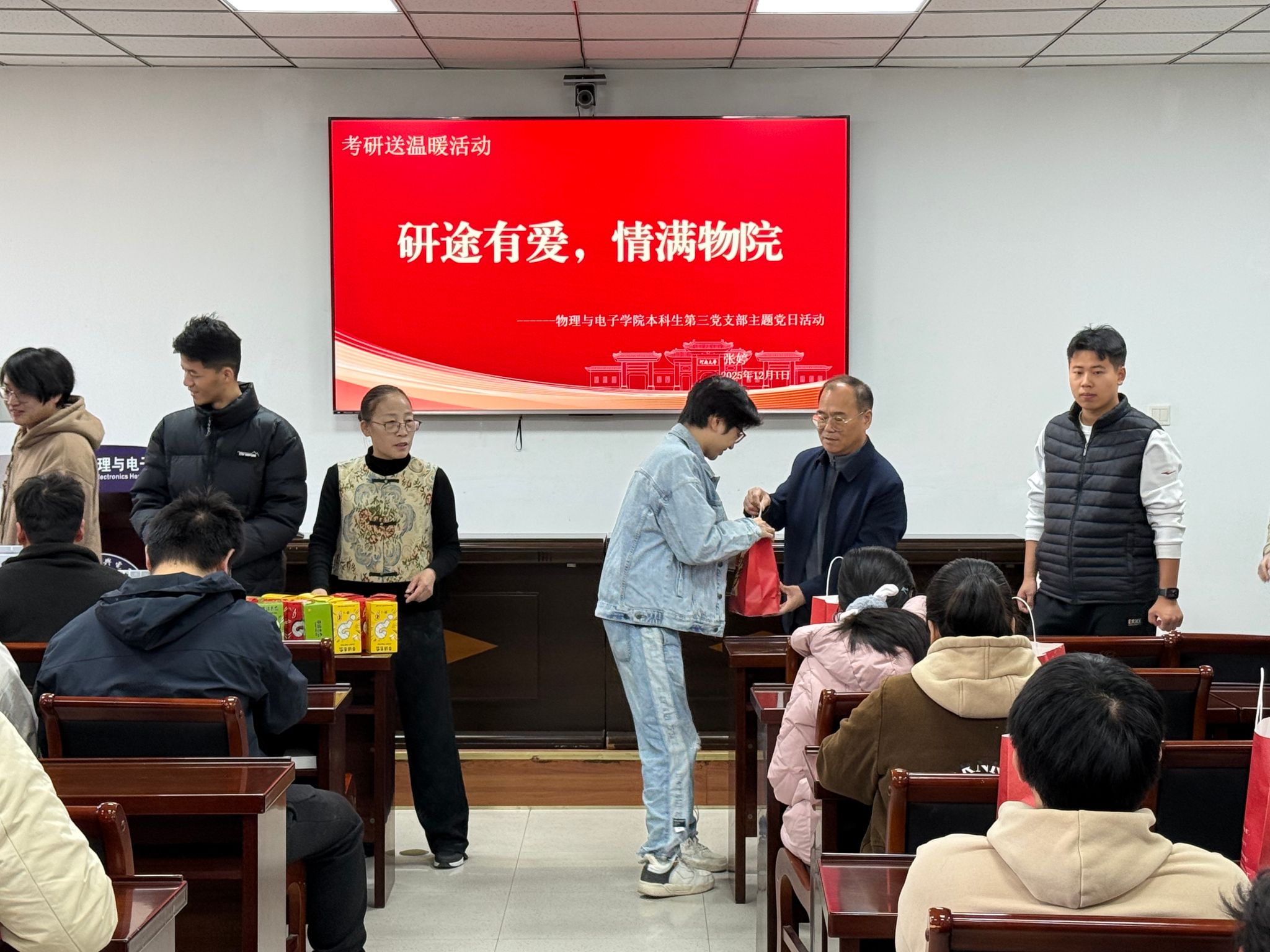句句叮嘱传关爱,份份礼包聚力量。此次活动是支部落实立德树人根本任务、践行“党建+服务”关爱学生成长成才的具体实践,不仅为备考学子带来了物质支持,更给予了精神慰藉与奋进动力。相信物院考研学子们必将承载着这份温暖与期盼,自信奔赴考场,笔锋所至,梦想花开。