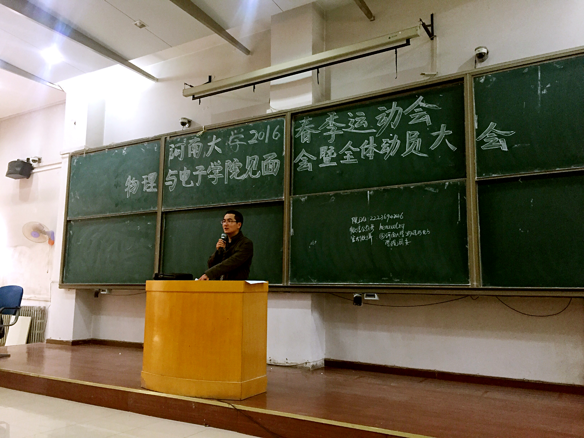春季运动会动员大会在综合楼1201召开。党委副书记乔石豪出席会议并发表讲话。2014级辅导员李嘉妍、2015级辅导员王栋、学生会全体成员、青协全体成员、全体学生运动员参加会议。
