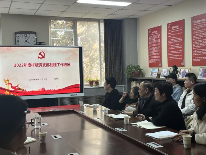 大学物理教工党支部书记康缈介绍了在培育创建样板党支部过程中的有效举措和“党建+课程思政”的特色做法。双方围绕党建与业务工作融合、党建活动形式、支部凝聚力与战斗力建设等方面进行了深入交流,并就师德师风建设、课程思政建设等进行热烈讨论和沟通。