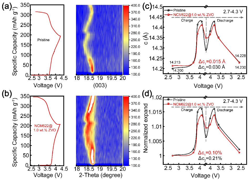 图2.原位XRD探究ZrV2O7对电极循环过程中微结构变化的抑制作用