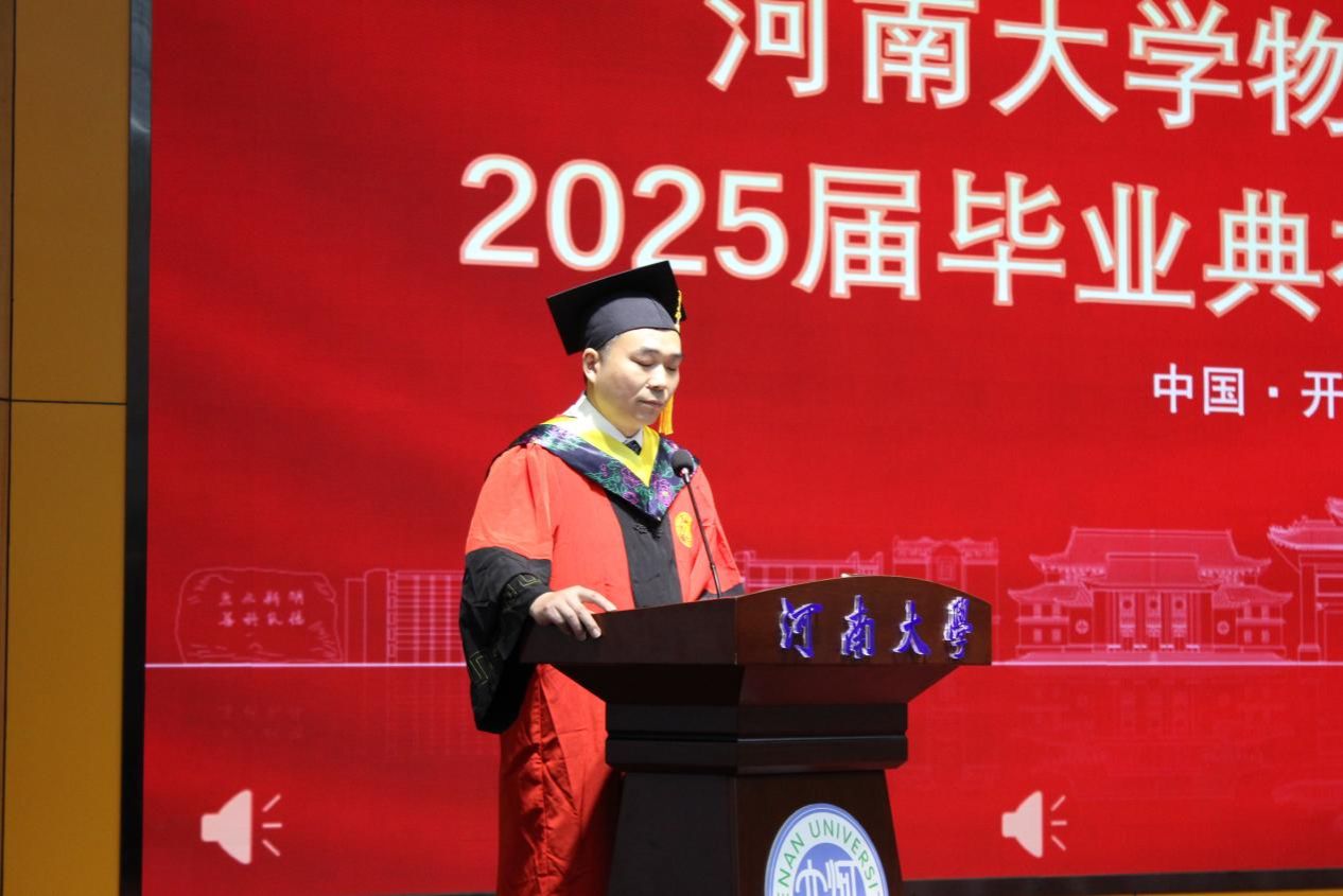 10:10典礼在庄严的国歌声中拉开帷幕。河南大学物理与电子学院学位评定分委员会副主任、学院副院长李新营宣读物理与电子学院2025届《毕业生学位授予决定》。
