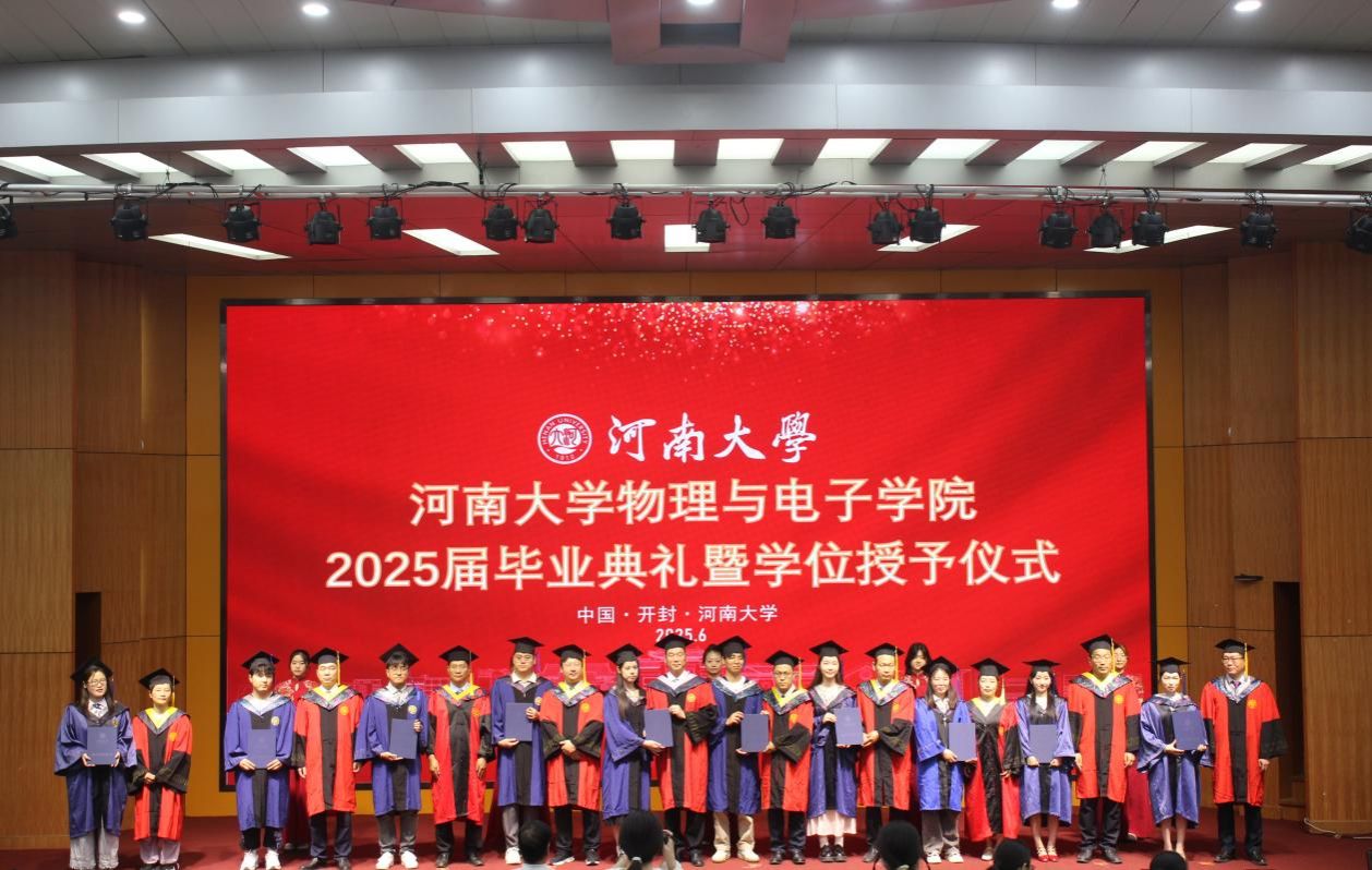 在学位授予仪式中,河南大学学位评定委员会委员、河南大学物理与电子学院学位评定分委员会主任、学院执行院长李国强为博士学位获得者扶正流苏并授予博士学位。学院学位评定分委员会委员、学院领导、老师代表依次为获得硕士及学士学位的毕业生援正流苏、授予学位,毕业生身着学位服有序登台,接受院领导与导师的拨穗正冠并合影留念。整个仪式不仅象征着学术成就的荣光,更生动体现了师生间知识传承与精神接续的深厚纽带,彰显了大学教育中薪火相传的永恒价值。