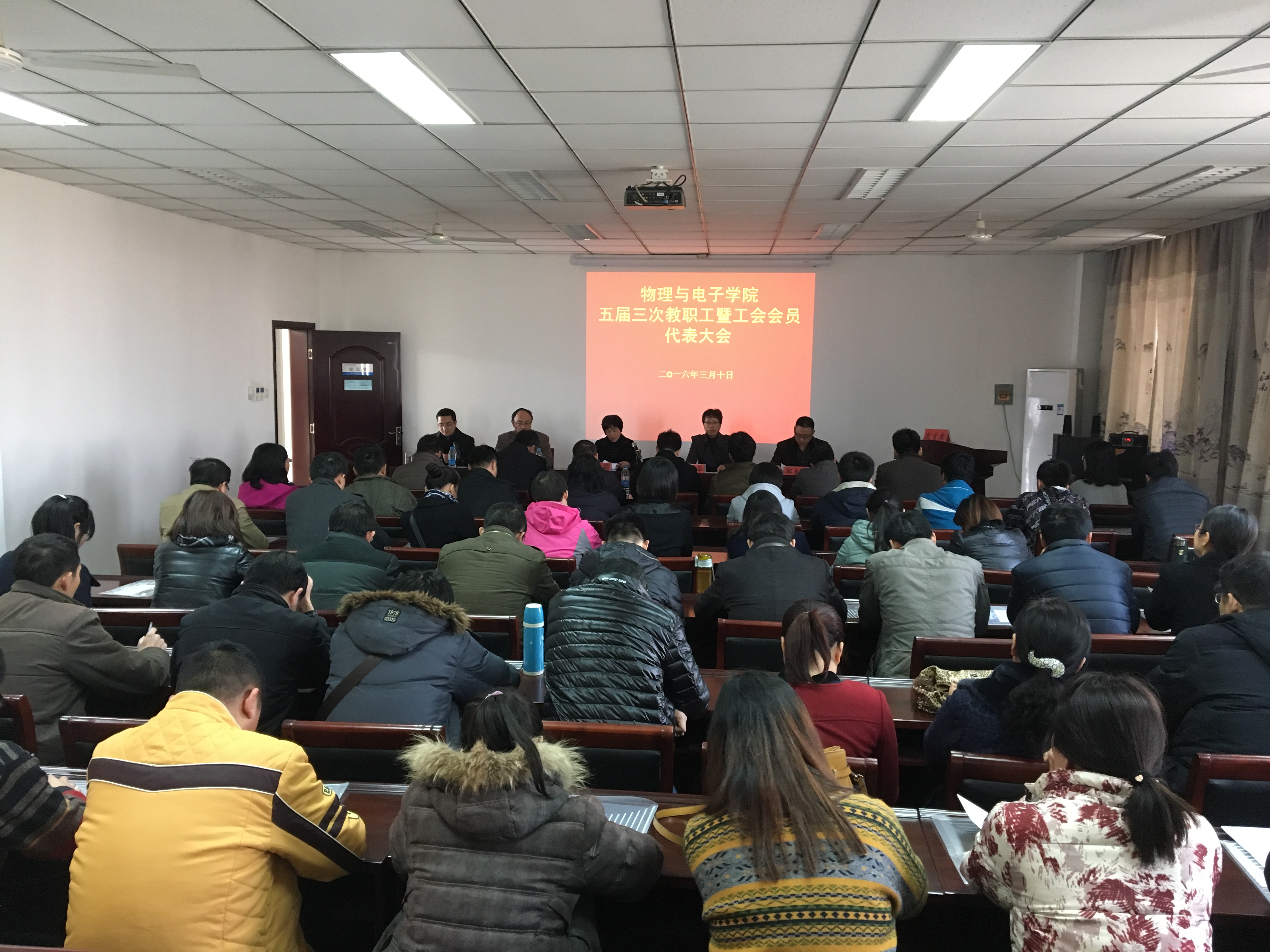 五届三次教职工暨工会会员代表大会在学院B座302教室举行。校工会副主席罗莉、学院领导班子全体成员、教工代表、特邀及列席代表与会。大会由院党委副书记乔石豪主持。