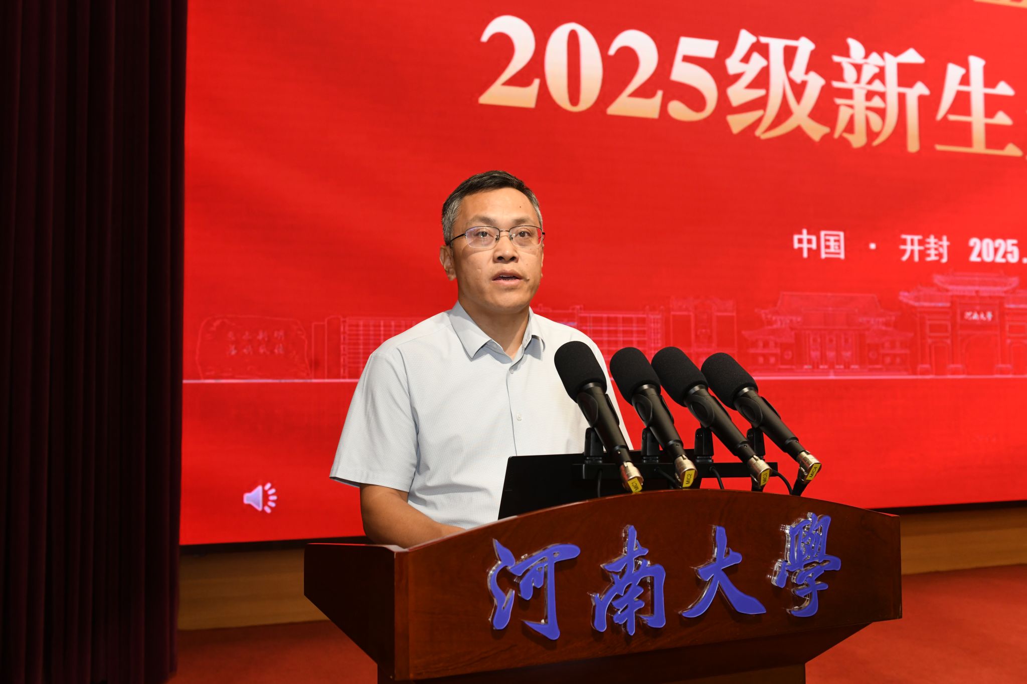 典礼结束后,学院党委书记张慧以《坚定信念 志存高远 以青春之我勇当时代先锋》为题,为全体新生讲授开学第一堂思政课。他围绕伟大建党精神、抗战精神、“两弹一星”精神、红旗渠精神、改革开放精神等中国共产党人精神谱系,结合学校百年办学历史和学院发展实际,引导新生深刻理解个人成长与国家命运、民族复兴之间的紧密联系。他鼓励新生以“自信、拼搏、开放、创新”的新河大精神为指引,胸怀“国之大者”,在学习实践中锤炼过硬本领、在创新发展中勇担时代使命,将青春奋斗融入党和人民事业,为实现中华民族伟大复兴贡献智慧与力量。