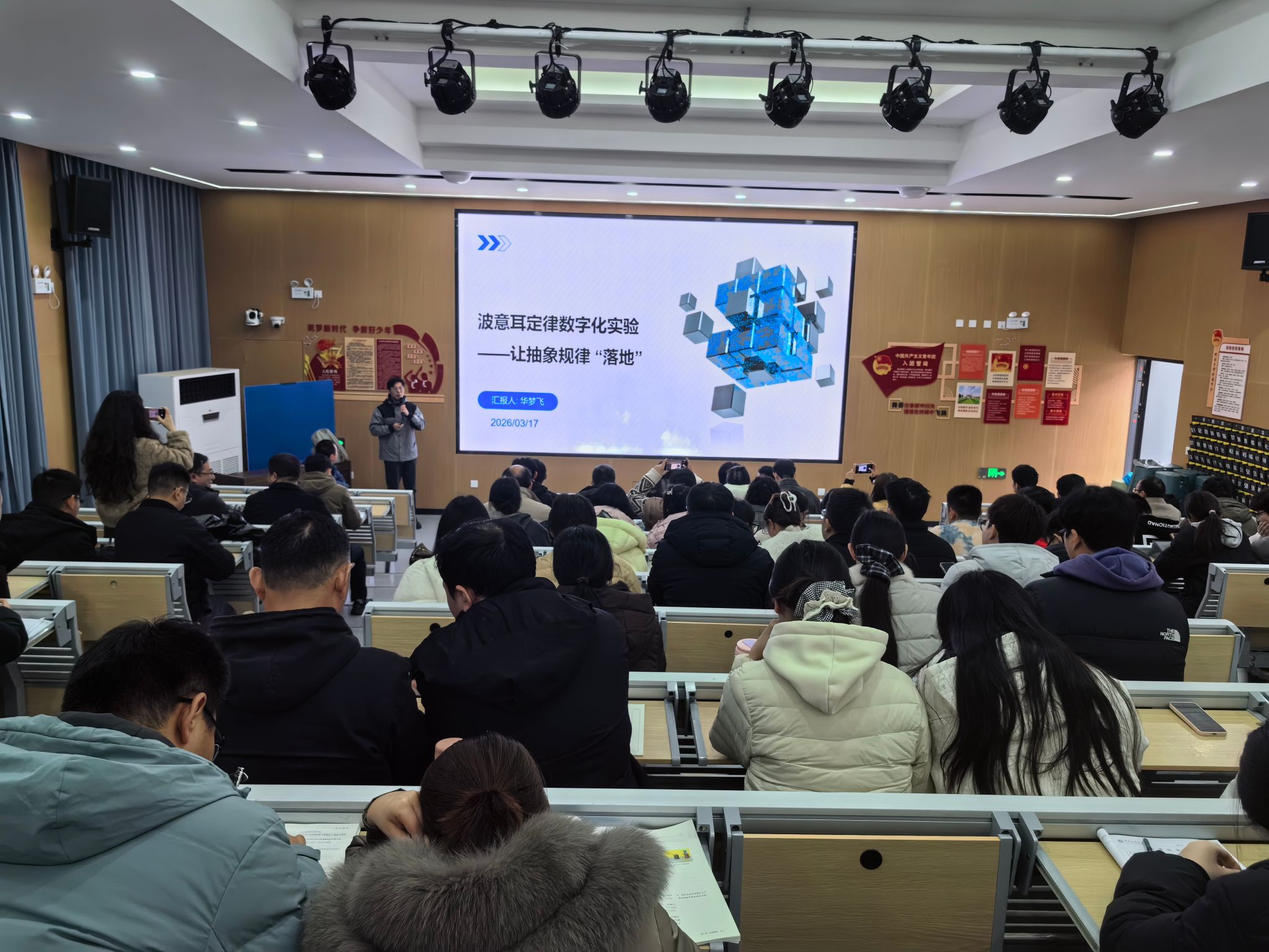 魏凌教授介绍此次活动依托中心国家级资源推动校地物理教育深度融合,精准对接开封高中物理教学实际与高考备考需求,为中学破解实验教学难点提供新思路。分享环节,师生团队将高校前沿研究与中学课堂实践深度结合:本科生赵业旺分享全国大学生物理实验竞赛一等奖成果《PVDF 基柔性弱压力传感器》,为中学实验创新拓展方向;研究生周义祥探索牛顿第二定律数字化教学,打通实验教学与高考应试能力提升的衔接路径;研究生华梦飞以波意耳定律教学设计为题,用生活化案例和可视化手段让抽象规律落地,提供可直接复用的教学范例。