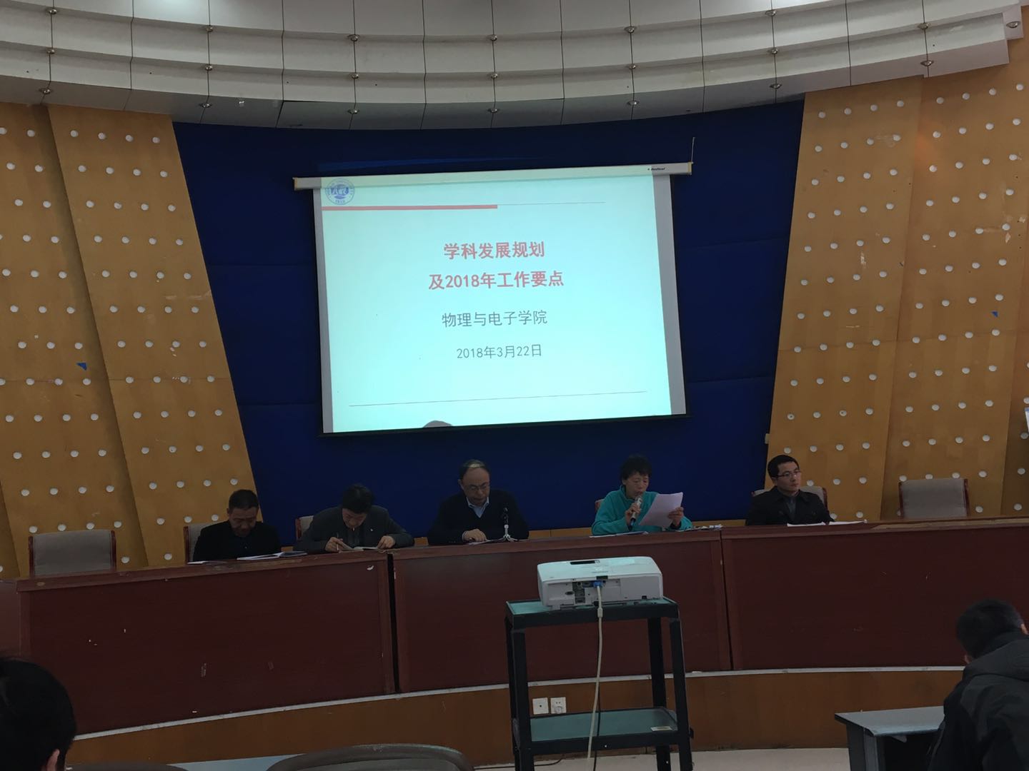2018年度工作会议精神,并结合学院实际就学科发展规划和2018年各项工作进行了安排部署。他表示,物理学一级博士点的获批,是继国家级实验教学示范中心之后,学院获得的又一个重大历史性突破,为学院学科建设提供了新的发展平台和动力。今后学院的所有工作都要紧紧围绕“学科建设”开展,人人都要为学科建设做贡献。他从师资队伍、教学、科研、学生工作等方面对2018年工作提出了新的要求,希望大家切实提高思想认识,把思想认识统一到学校2018年工作会议精神上来,立足学院实际,干好本职工作,力争学院的各项事业在2018年迈上一个新的台阶,为建设双一流学院贡献自己的力量。