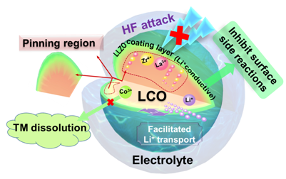 锂离子电池具有能量密度大、输出电压高、循环寿命长、环境污染小等优点,已在便携式数码电子产品中获得广泛应用,在电动汽车、大型储能、航空航天等领域亦具有广阔的应用前景。为了在有限的体积下获得高电池容量,除了使用高比容量正负极材料、高能电解液、更薄隔膜外,提高其充电截止电压也是一种重要手段,因此这就需要使用高电压正极材料。在该研究工作中,白莹课题组将一种典型的快离子导体Li7La3Zr2O12包覆于广泛商用的锂离子电池正极材料LiCoO2表面,利用Li7La3Zr2O12材料的电化学稳定性及其高的离子传导特性,一方面隔绝LiCoO2正极材料与电解液直接接触,稳定高电压长循环过程中LiCoO2的表面结构,抑制Co元素溶出与界面阻抗增长,另一方面有效地提高LiCoO2材料的Li+传输性能,稳定材料室温与高温下的电化学性能。同时,Li7La3Zr2O12是一种受到广泛关注的固态电解质材料,在当前高安全性全固态电池材料研发应用中具有重要地位。因此,本研究工作不仅为高电压二次离子电池材料界面的构筑和调控以及性能提供了新途径,而且对设计高电压高能量密度高稳定性的先进固态电池提供了新的研究思路和技术手段。