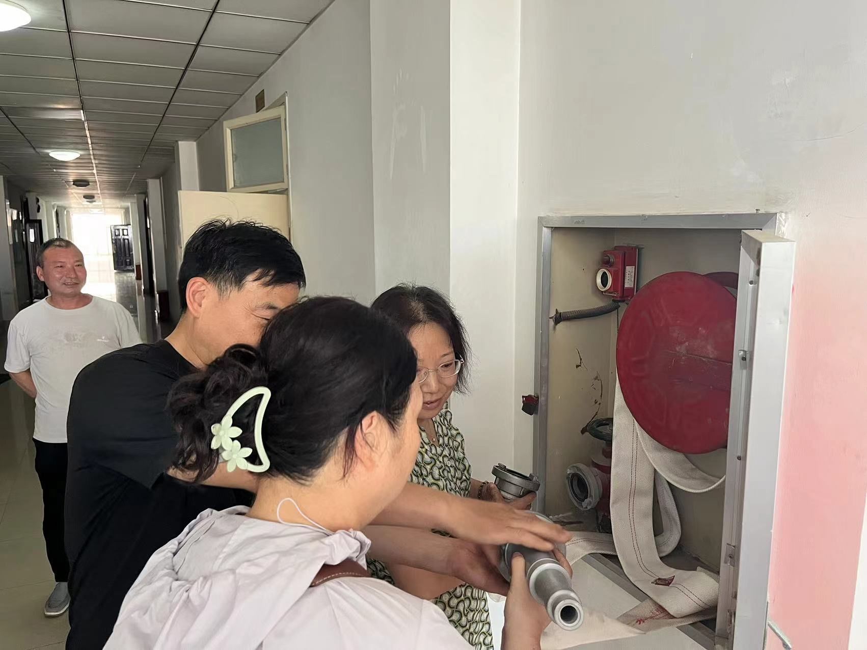 随后,在物理楼 A 栋,消防科副科长刘川申带领专家亲临现场进行专业指导。师生们在专家的悉心引领下,实地演练了消火栓的连接、使用、拆卸等关键技能。大家热情高涨,积极踊跃参与,全神贯注地按照操作步骤认真练习。最终,打开消火栓成功进行了模拟灭火操作,亲身感受和体验了灭火的紧张过程。