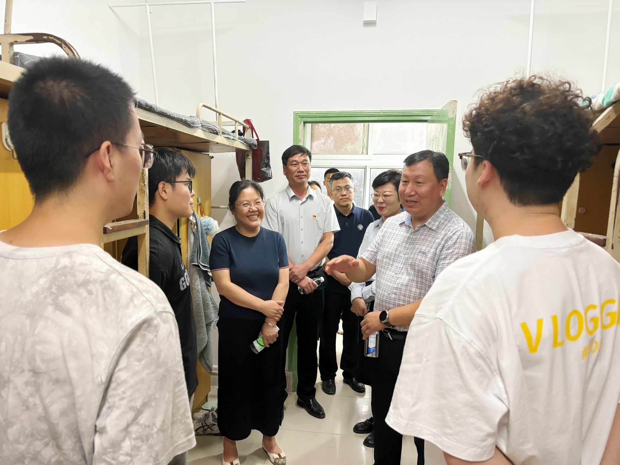 领导班子不期而遇,一同前往新生宿舍开展走访慰问,与同学们进行亲切交流。