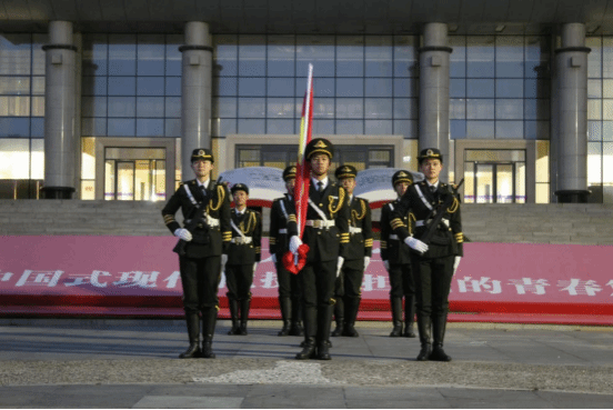 清晨6时20分,国旗护卫队迈着整齐的步伐将国旗护送至升旗台,全体师生肃立,在庄严的国歌声中,注视着国旗与朝阳一同冉冉升起。