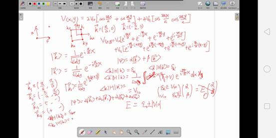 当然了,为了更高效的在网上学习,老师们同样也绞尽脑汁,其中固体物理学老师张光彪老师,为了让我们更好地掌握知识,还设置了讨论课和习题课,专门解答同学们上课中的问题,比如,声子那一小节(图二)。为了跟线下上课一样,老师还准备了白板作为课堂上的“黑板”,如果有需要推导的公式,他就会一点一点的给我们推导,若果我们没有搞懂,他就会在给我们推一遍,我尤其印象深刻的是在讲近自由电子近似的时候,公式推导非常繁琐,头一天我花了好长时间也没有搞清楚,第二天,我就在课上请教了老师,老师很耐心的又给我们讲了一遍,虽然这个过程中我们花费了许多时间,但同时我们也收获了许多(图三)。