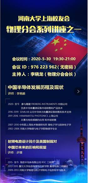 上海校友会物理与电子分会通过线上视频会议的方式,举办了以“中国半导体发展历程及现状”、“射频电路设计简介及美国制裁对中国芯片未来的影响和展望”为主题的讲座。讲座由物理与电子分会会长李晓龙主持,130余位校友参加。