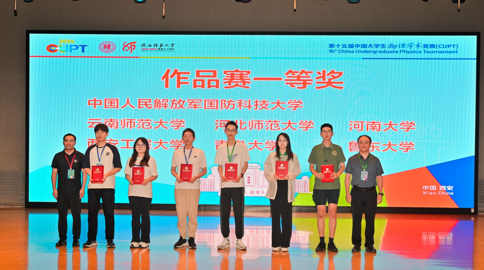 8月18日至23日,由中国大学生物理学术竞赛全国组委会主办、陕西师范大学承办的第十五届中国大学生物理学术竞赛(简称CUPT)在陕西西安举行。来自全国95所高校的96支代表队800余名师生参加了决赛。作为代表我校首次参赛的物理与电子学院秦豪宇代表队在指导老师刘平安、魏凌的带领下,获得全国作品赛一等奖、最佳人气奖第一名的好成绩!