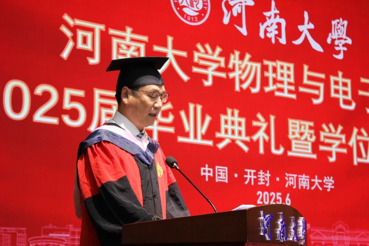 张慧充分肯定了毕业生取得的优异成绩,回顾了同学们与时代同频、与学校共荣的成长历程,以及学院在学科建设、人才培养领域的突破性成就。他指出作为2025届毕业生既是亲历者,更是参与者和贡献者。如今同学们即将奔向星辰大海,开启新的人生篇章。张慧以四句临别赠言与毕业生们共勉:一是持“格物穷理”之心,永葆对未知的好奇与探索的勇气,永怀赤子之心,做真理世界中永不疲倦的探索者;二是秉“明理致用”之志,将智慧转化为推动进步的磅礴力量,服务于国家所需、人民所盼,在建设科技强国和教育强国的伟大征程中刻下河大物电人的印记;三是守“求真务实”之道,用行动践行教育家、科学家精神,奋楫笃行、臻于至善,以科技之光照亮科教发展之路、以实干之光照亮人才成长之路;四是铸“家国情怀”之魂,在强国建设中书写不负时代的青春华章,将个人的职业规划与国家的发展战略紧密相连,心系“国家事”、肩扛“国家责”。最后他希望同学们无论飞多高、多远,学院永远是精神家园,期待大家常回母校,共叙情谊。