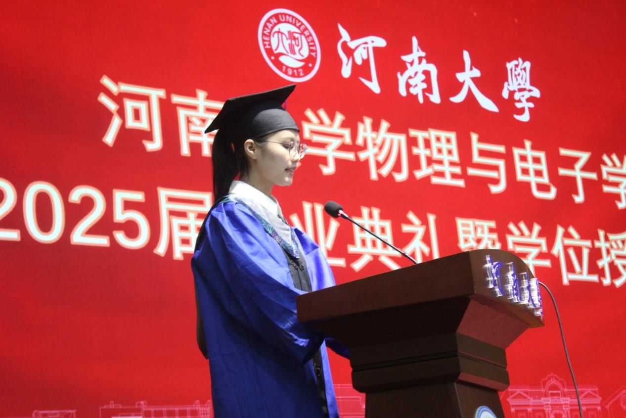 10:10典礼在庄严的国歌声中拉开帷幕。河南大学物理与电子学院学位评定分委员会副主任、学院副院长李新营宣读物理与电子学院2025届《毕业生学位授予决定》。