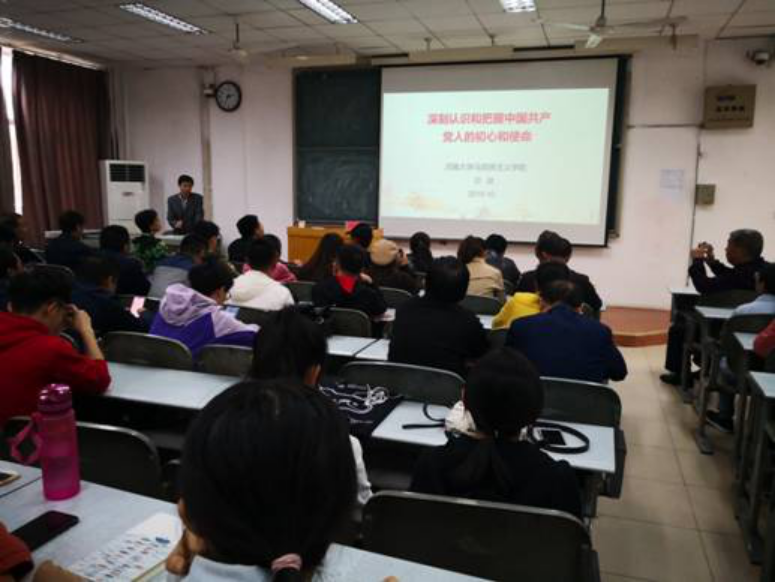 10月10日下午2:30,物理与电子学院党委在金明综合楼6101教室举行“不忘初心 牢记使命”主题教育报告会,邀请马克思主义学院教授欧健做了题为《深刻认识和把握中国共产党人的初心和使命》的报告。报告由学院党委书记王宏华主持,学院全体师生党员聆听了报告。