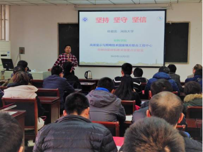 杜祖亮以特种功能材料重点实验室的宣传片为引子,以“坚持 坚守 坚信”为题,热情洋溢地向大家讲述了材料学院培植青年人才,勇攀科研高峰的先进事迹。杜祖亮讲述了为新时期河南大学理工科发展做出奠基性贡献的朱自强先生的经历,正是在朱先生不计名利、忘我工作的态度和艰苦奋斗、自强不息作风的激励、鞭策下,他带领团队全力以赴,不畏艰难、矢志不移地在科研的道路上努力拼搏进取,才取得现有成绩。他着重讲了特种功能材料重点实验室的发展历程,科研、平台与人才的关系。从他的讲述中,大家能深刻地感受到材料学院言传身教、对培养青年人不遗余力的育人理念;感受到他们科研工作中的团队协作、奋力拼搏精神;感受到他们坚持科研、坚守初心、坚信胜利的信念和决心!