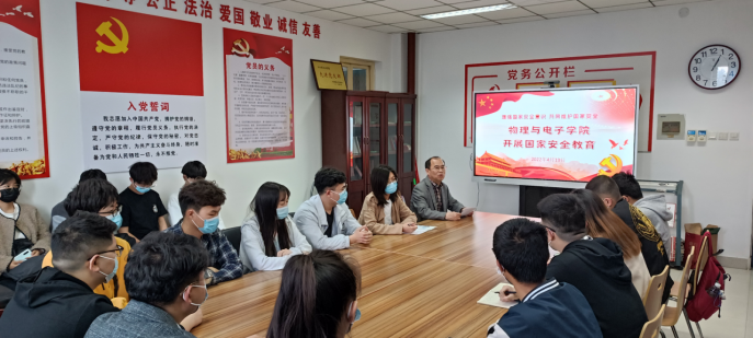 在第七个全民国家安全教育日来临之际,为普及国家安全知识,增强全体师生国家安全意识,为党的二十大胜利召开营造良好氛围,4月13日中午物理与电子学院在A309通过线上线下相结合的形式开展“全民国家安全教育日”宣传活动。学院党委副书记刘寒冰、全体辅导员及各年级学生参加此项活动。