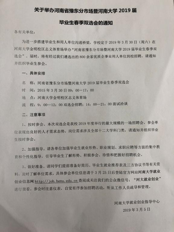 关于举办河南省豫东分市场暨河南大学2019届毕业生春季双选会的通知