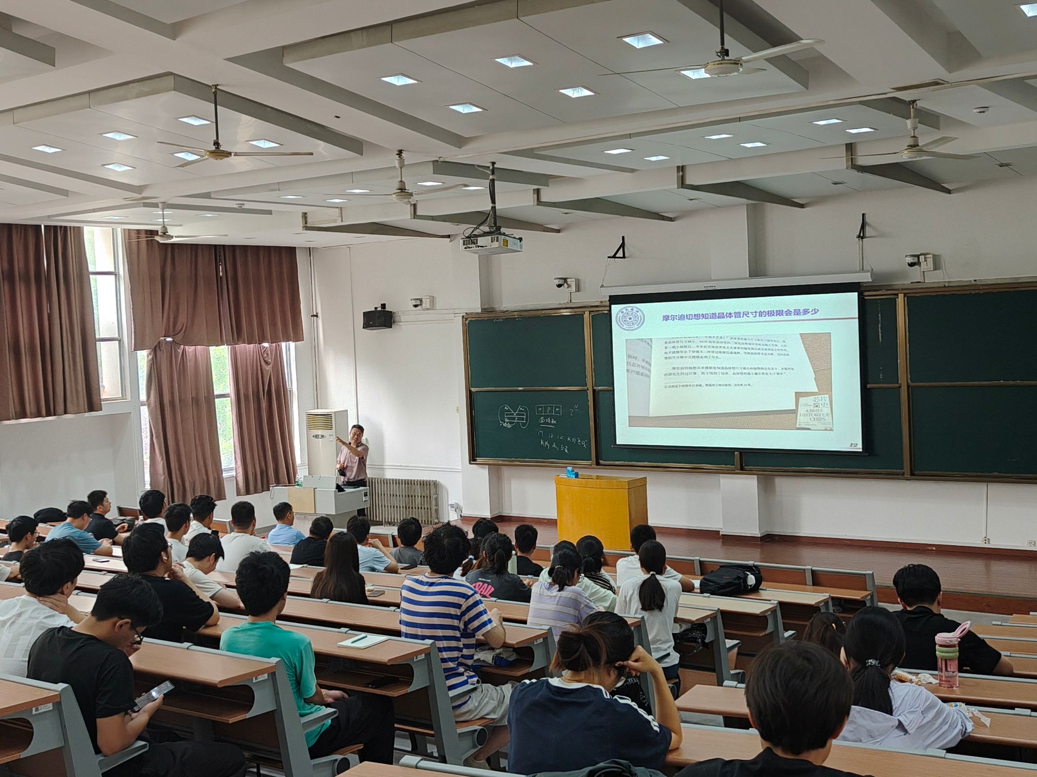 科研训练课程邀请了6位校内外专家开展专题讲座:刘仁明教授系统讲解量子力学研究进展,内容涵盖从薛定谔方程到量子计算应用;李杰教授重点介绍卤氧化铋光催化材料在环境治理中的应用;王超教授通过热电材料的发展历程,分析其在工业余热利用中的技术突破。此外,朱经亚教授、李航教授和潘根才教授分别就高能物理、低维材料和钙钛矿等研究方向进行了深入讲解。在实践环节,学生们分组操作了扫描电子显微镜、X射线衍射仪等大型科研设备,完成了材料表征、数据分析等实践任务。