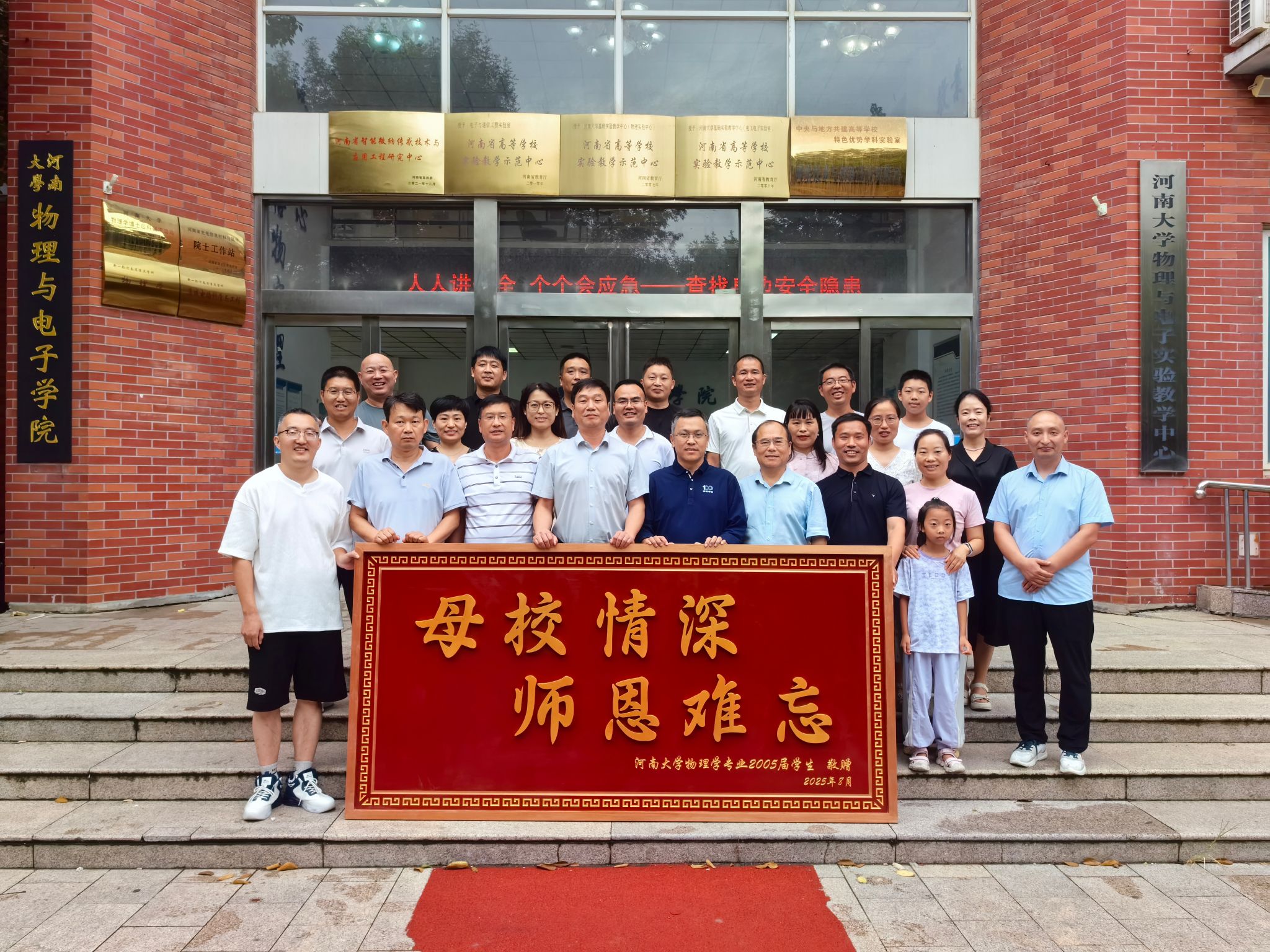 为表达对母校培育之恩的深切感念,2005届校友向学院敬献“母校情深、师恩难忘”的纪念匾额,在物理与电子学院门前合影,将二十年光阴定格为永恒的瞬间。期待广大校友持续助力学校与学院发展,携手开创河南大学更加辉煌的未来。