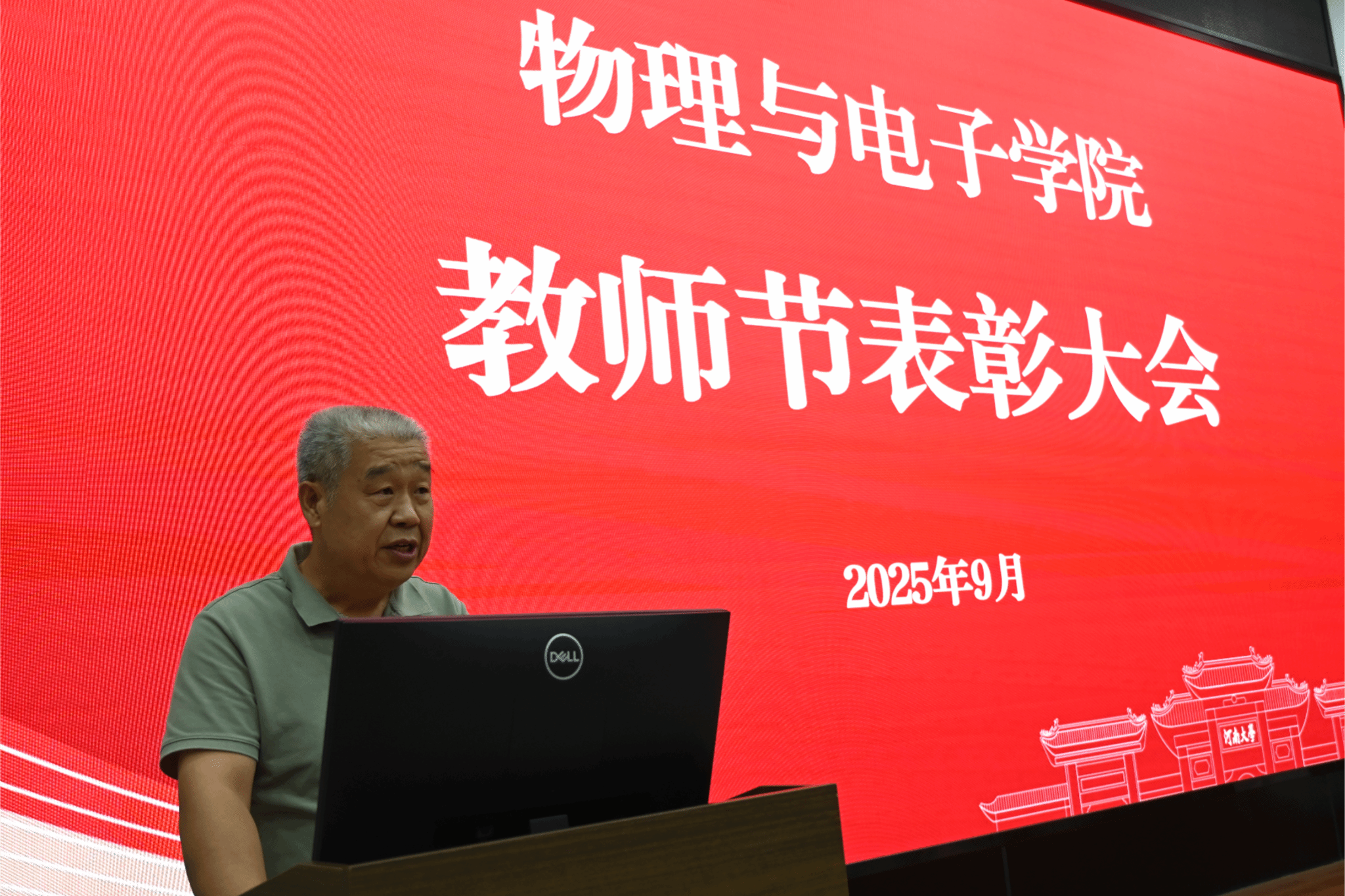 为表彰先进典型、弘扬高尚师德,进一步凝聚力量,近日,物理与电子学院在金明校区锥形报告厅召开2025年教师节表彰大会,学院全体教职员工参会。会议由学院党委书记张慧主持。