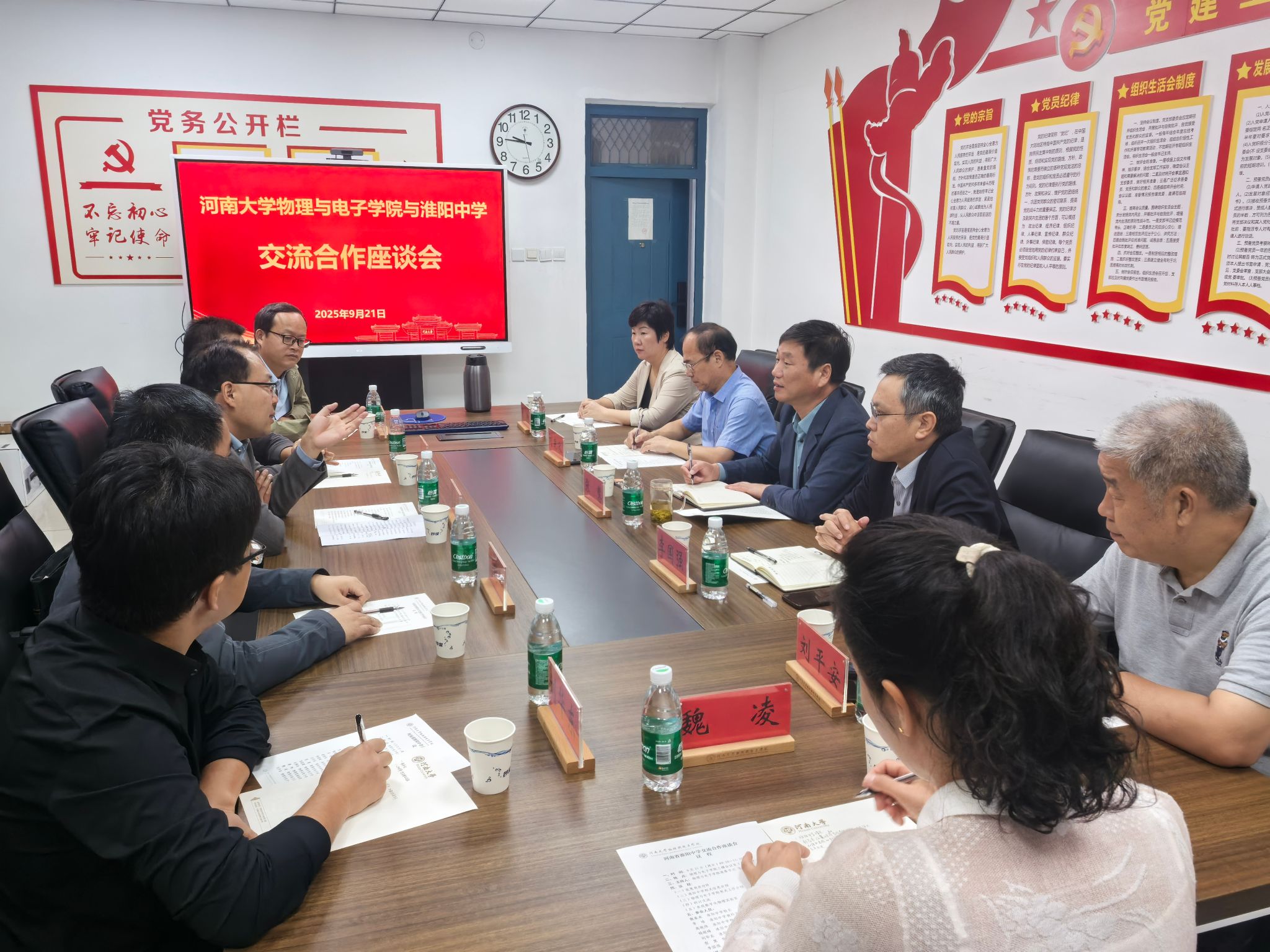 9月21日,淮阳中学校长魏泰来一行到访河南大学物理与电子学院,围绕人才培养、科普教育、学科基地和师资队伍建设等深度交流。“全国最美教师”“ 河南省师德先进个人”刘华东,学院党委书记张慧、执行院长李国强、副书记刘寒冰及学院骨干教师代表参会。