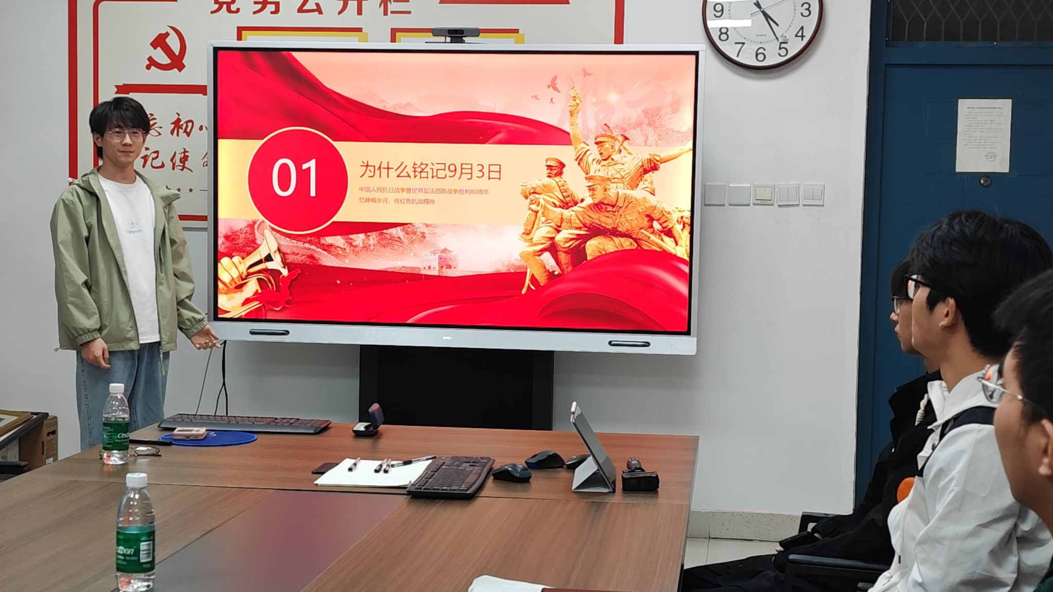 党员代表分别以“赓续抗战精神”“重温英雄故事”“争当时代传人”等为主题上台分享,并展开热烈讨论。党员王恒:“通过此次活动,我更深刻地认识到今天的和平生活来之不易。作为物电学生,我会努力学好专业知识,将来用科技为国家发展贡献力量。”其他党员也纷纷结合自身学习和生活实际,畅谈对历史的感悟与未来的奋斗方向,现场氛围浓厚。最后,全体党员重温入党誓词,誓言庄严回荡。