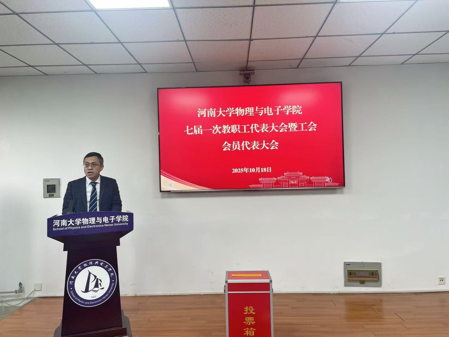 徐飞代表校工会致辞,他对大会的召开表示热烈祝贺,高度肯定了物理与电子学院近年来在各方面取得的成绩。他指出,学院在推动自身高质量发展的同时,为学校建设注入了强劲动力,希望学院以此次大会为契机,持续深化改革创新,为学校事业发展作出更大贡献。