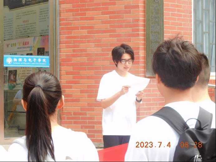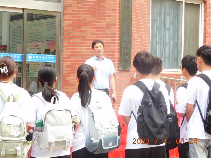为深入学习宣传贯彻习近平新时代中国特色社会主义思想和党的二十大精神,引导和帮助广大青年学生在与现实相结合的“大思政课”中“受教育、长才干、作贡献”,引领青年大学生立志做有理想、敢担当、能吃苦、肯奋斗的新时代好青年,7月4日上午,我院2023年暑期“三下乡”社会实践活动出征仪式在物理与电子学院A楼前隆重举行。学院党委书记张慧、党委副书记刘寒冰、辅导员张婷等出席本次出征仪式,出征仪式由党委副书记刘寒冰主持。