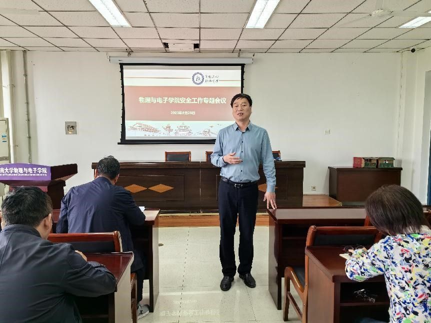 为落实上级部门关于中秋节国庆节期间安全工作的相关要求,进一步做好学院安全管理工作,2023年9月28日,物理与电子学院在物理楼A313会议室召开安全工作专题会议,会议由学院党委书记张慧主持,院党政班子成员、国家级实验教学示范中心负责人、系室主任、管理科室主任、科研实验室主任、安全员、辅导员参加了会议。