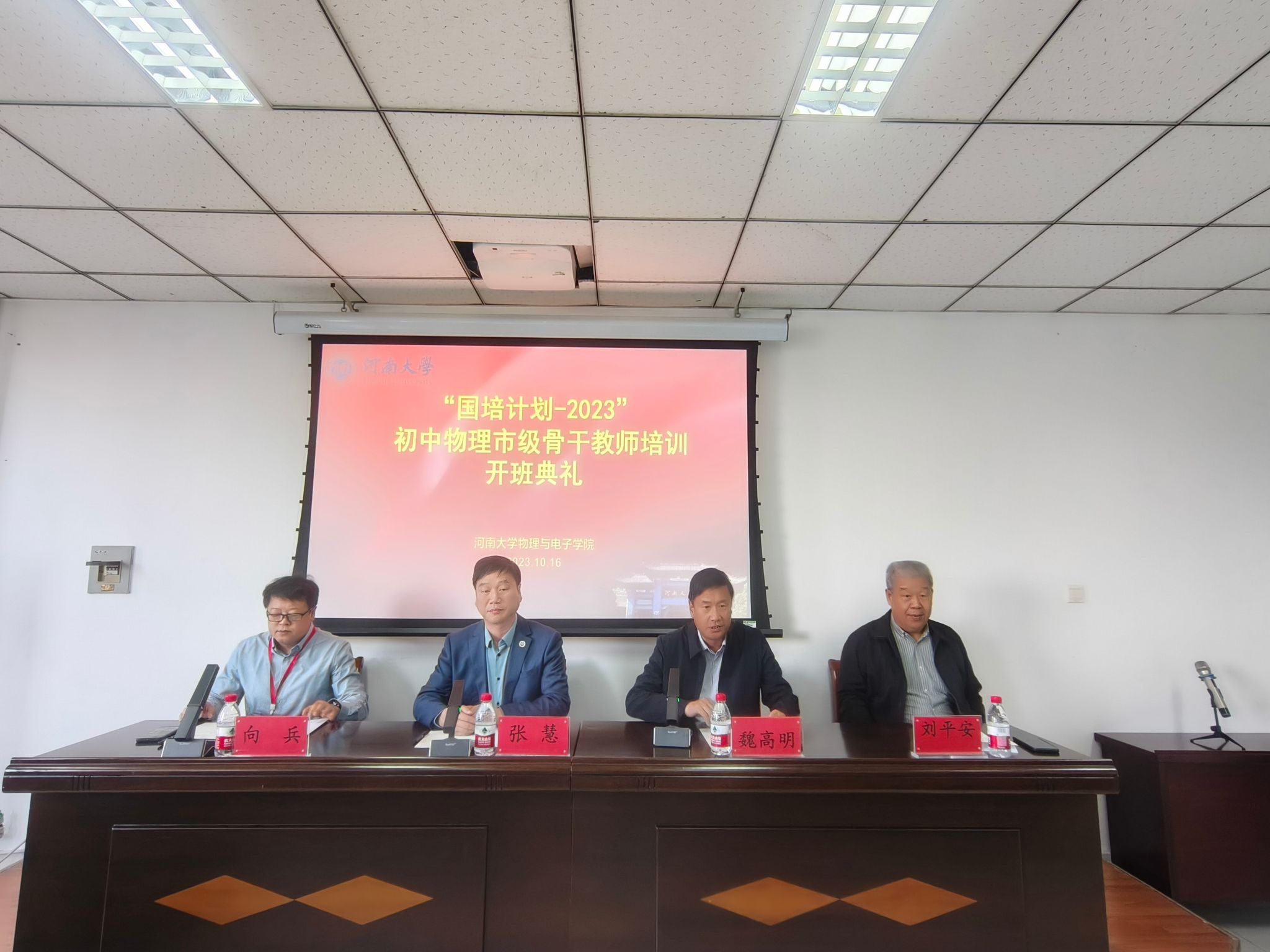10月16日上午,“国培计划-2023”初中物理市级骨干教师培训项目开班典礼在河南大学物理与电子学院的A313会议室举行。河南大学物理与电子学院党委书记张慧、副院长魏高明老师、国家级实验教学示范中心物理实验室主任刘平安老师、继续教育办公室主任向兵老师等有关负责人和来自全省各个县区50名初中物理骨干教师参加了开班典礼。