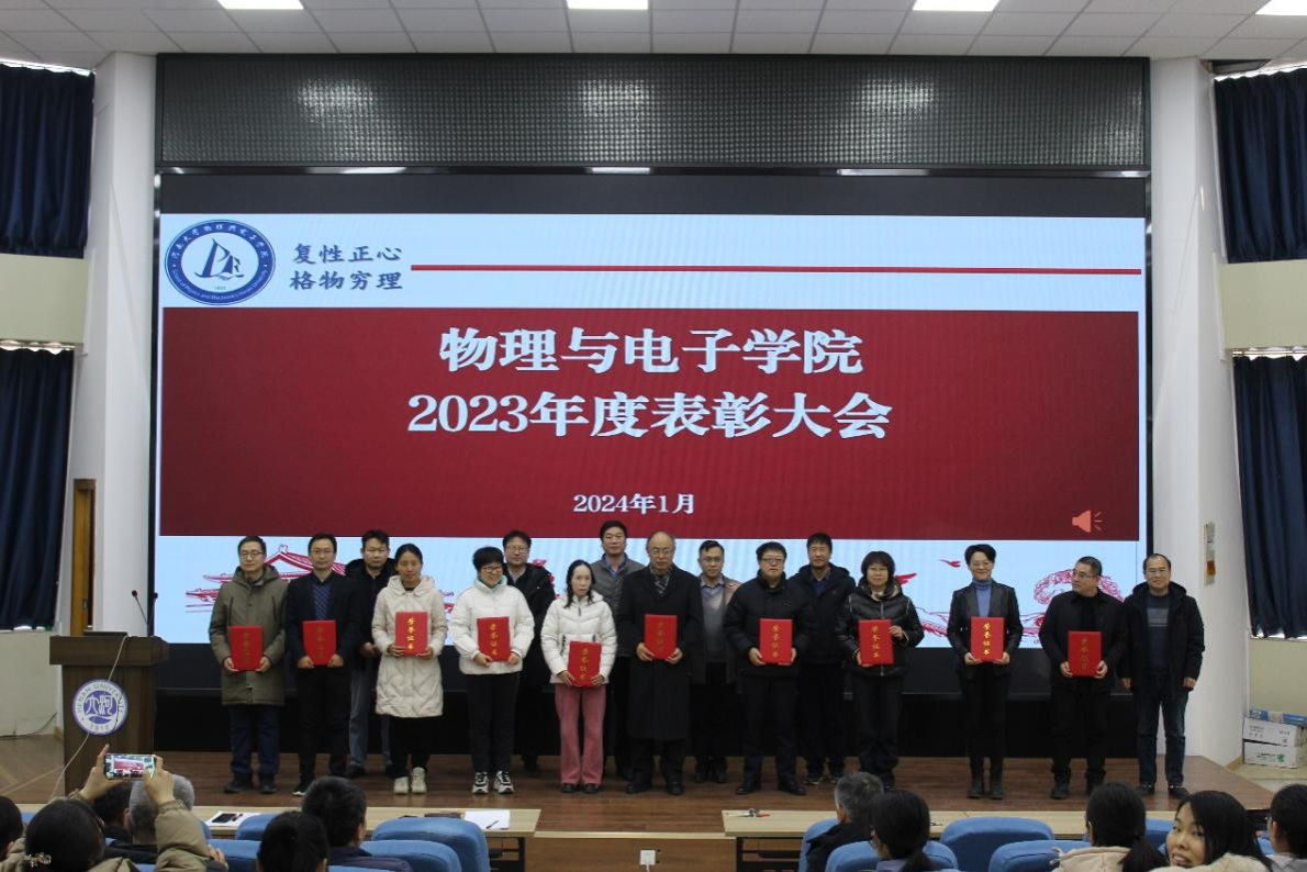 1月4日下午,物理与电子学院在金明校区锥形报告厅召开2023年度表彰大会暨考前动员大会。学院全体教职工参加会议,会议由学院副院长魏高明主持。