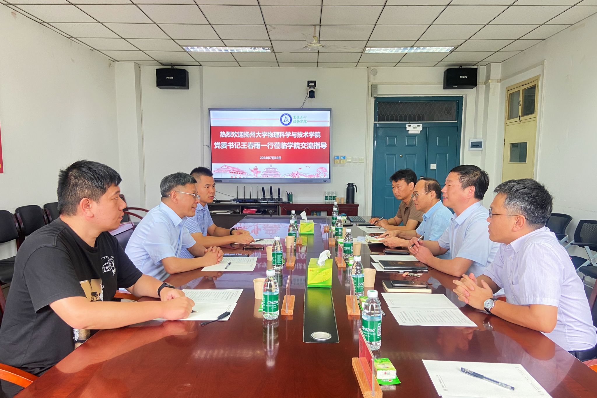 7月19日下午,扬州大学物理科学与技术学院党委书记王春雨、副书记毕瑜林一行3人来访我院,并在学院A311会议室召开座谈会。我院党委书记张慧、执行院长李国强、党委副书记刘寒冰、副院长李新营、研究生辅导员周焕参加座谈。