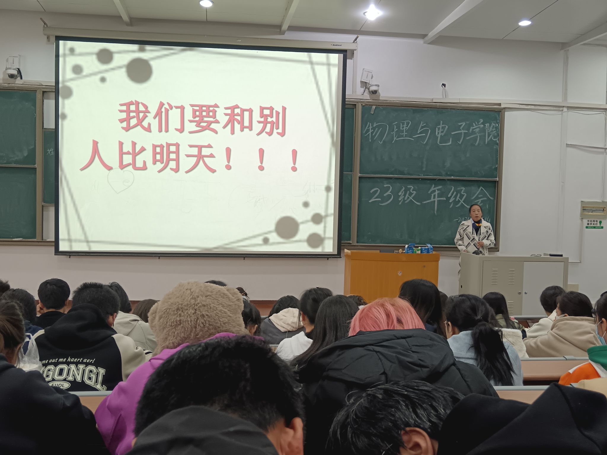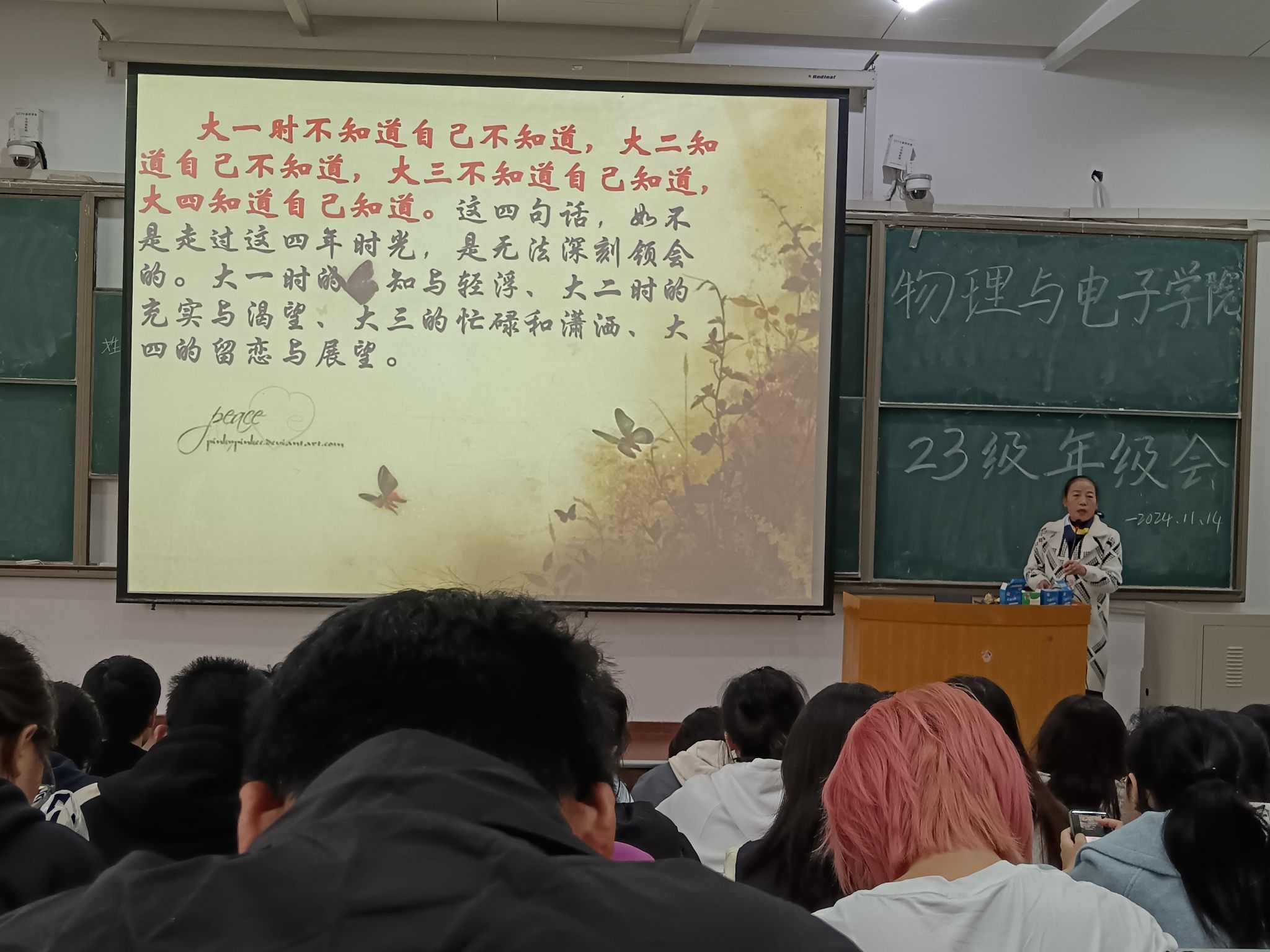 2024年11月14日下午,物理与电子学院在金明校区综合楼2306教室召开2023级本科生年级会。张婷老师主持会议并围绕“大学,青春无悔!”这一主题,从班级建设、心理健康教育、人生规划以及当前目标设定等多个方面展开讲解。