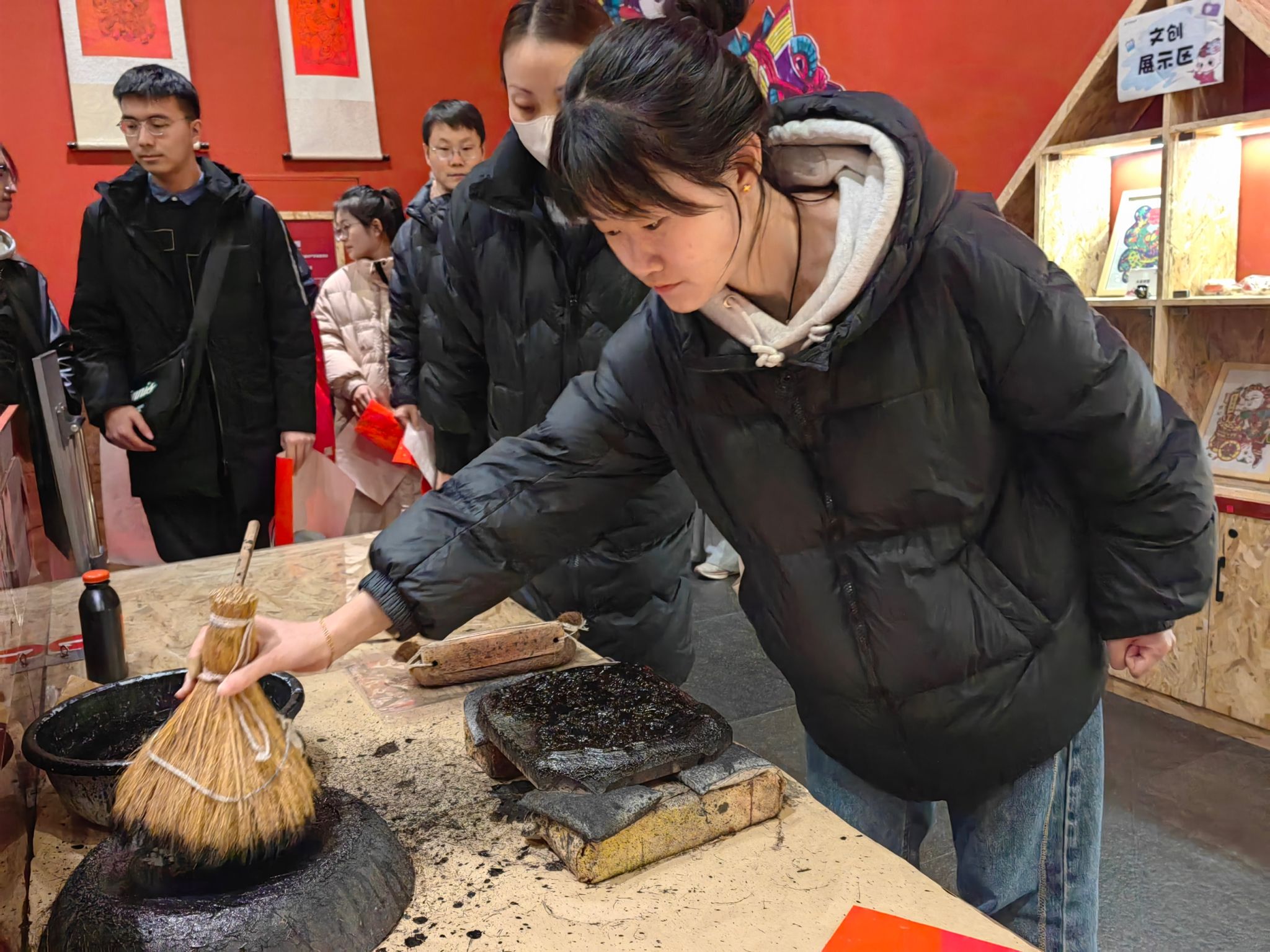 在讲解员的带领下,党员同志们参观了博物馆的主要展厅,全方位探索了开封长达八千多年的发展历程。从古代的政治变迁到经济的发展脉络,从科技的进步到文化的繁荣,再从艺术的辉煌到民生的发展,这些历史片段在眼前一一展现,仿佛穿越时空,亲身感受到了历史的发展和时代的风云变幻。师生党员在参观过程中,纷纷在北宋的“开封府题名记”碑、大晟夷则铜编钟、宋钧窑玫瑰紫窑变瓷碗等重要历史文物前驻足欣赏、认真观摩。活动最后,同学们还沉浸式体验了朱仙镇木版年画的印制过程。