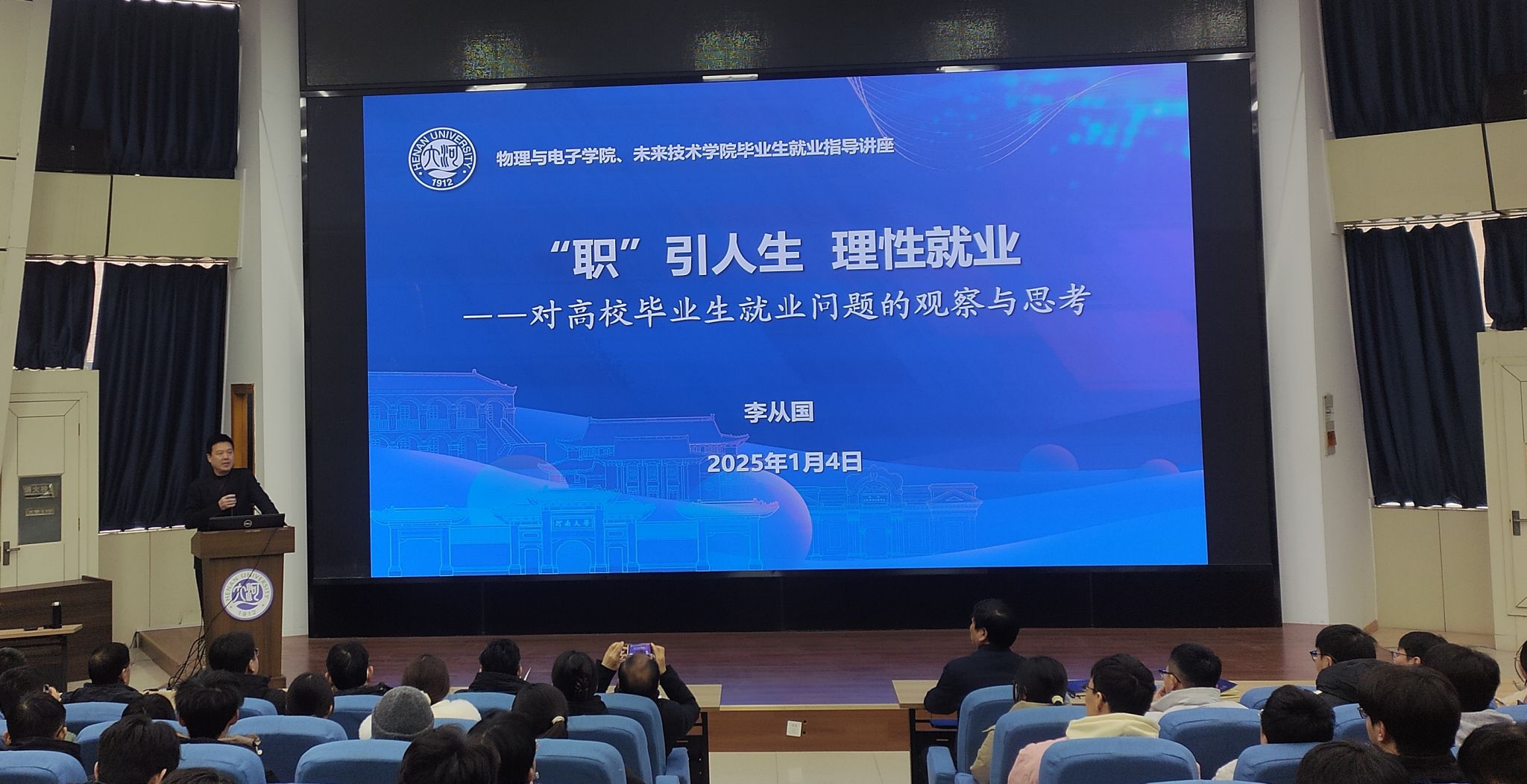 为贯彻落实《教育部关于做好2025届全国普通高校毕业生就业创业工作的通知》(教就业〔2024〕5号)、《河南省教育厅关于做好全省2025届普通高校毕业生就业创业工作的通知》(教学〔2024〕394号),认真落实全省高校毕业生就业创业工作推进视频会会议精神和学校工作部署安排,扎实做好毕业生就业创业工作,努力实现毕业生充分就业、高质量就业。1月5日,物理与电子学院、未来技术学院联合召开2025届毕业生就业工作推进会议。河南大学本科生院副院长、就业创业指导中心主任、创新创业学院院长李从国,两个学院领导班子、各系主任、教工党支部书记、全体辅导员和2025届毕业生参加了会议,会议由学院党委书记张慧主持。