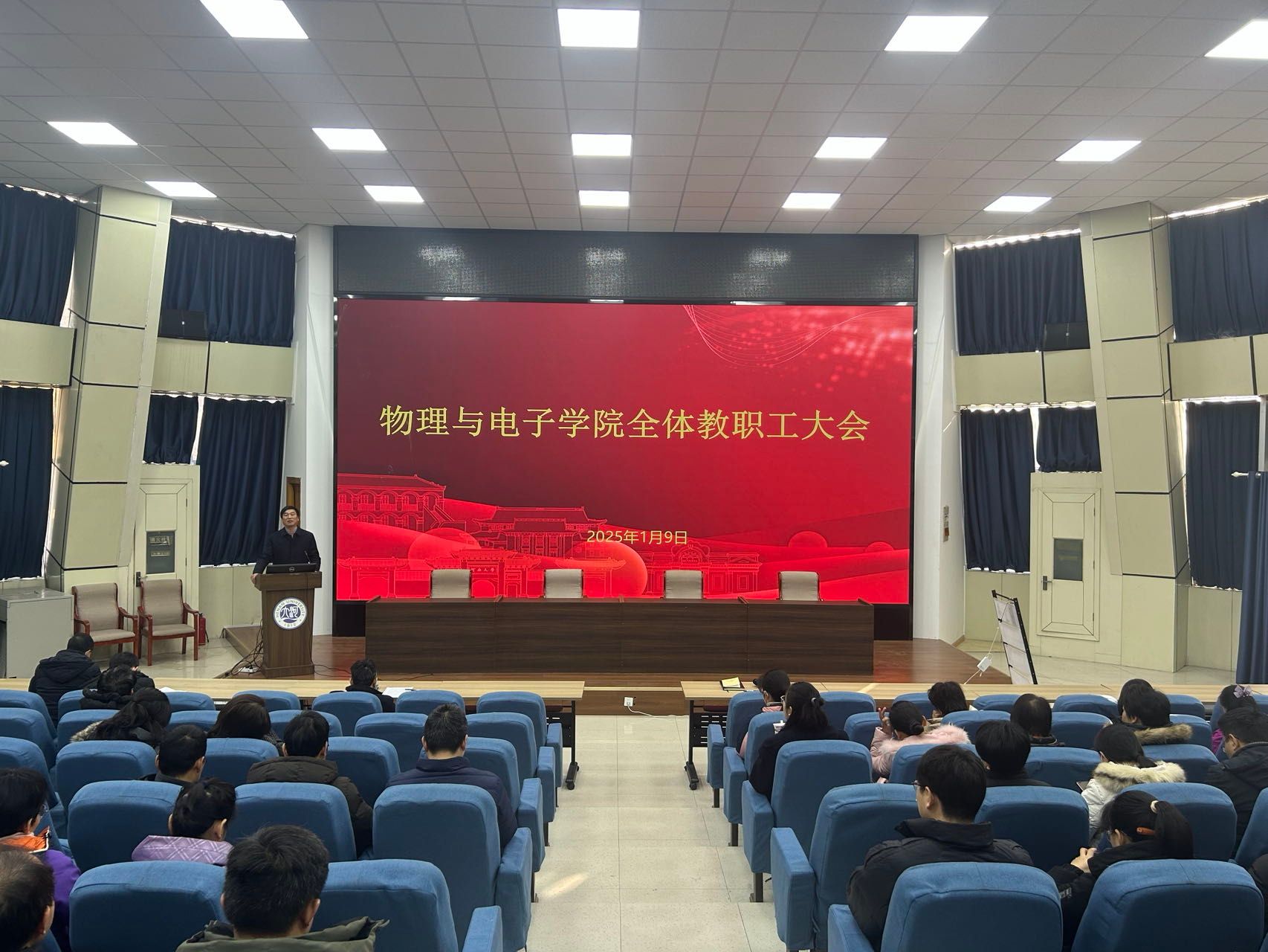 为凝聚全体教师力量,推动学院各项事业高质量发展,1月9日上午,物理与电子学院在锥形报告厅召开全体教职工大会。会议由学院党委书记张慧主持。