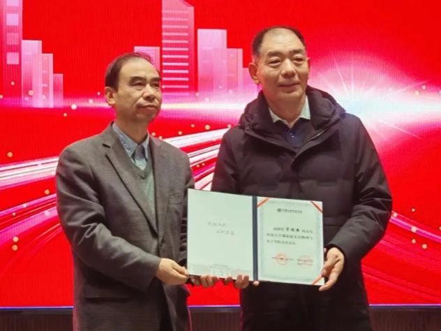 崔大祥向分会会长管保安颁发聘书并授旗。肖艳、物理与电子学院执行院长李国强为分会副会长、秘书长、副秘书长颁发聘书。