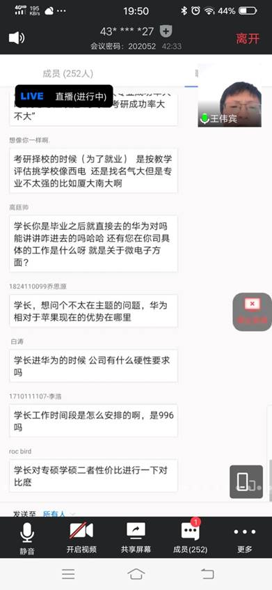5月2日晚上,我院邀请2005级校友王伟斌做客学院“校友论坛”,通过腾讯会议平台围绕“考研与就业”主题,与200余名学弟学妹们分享其学业、就业经历。